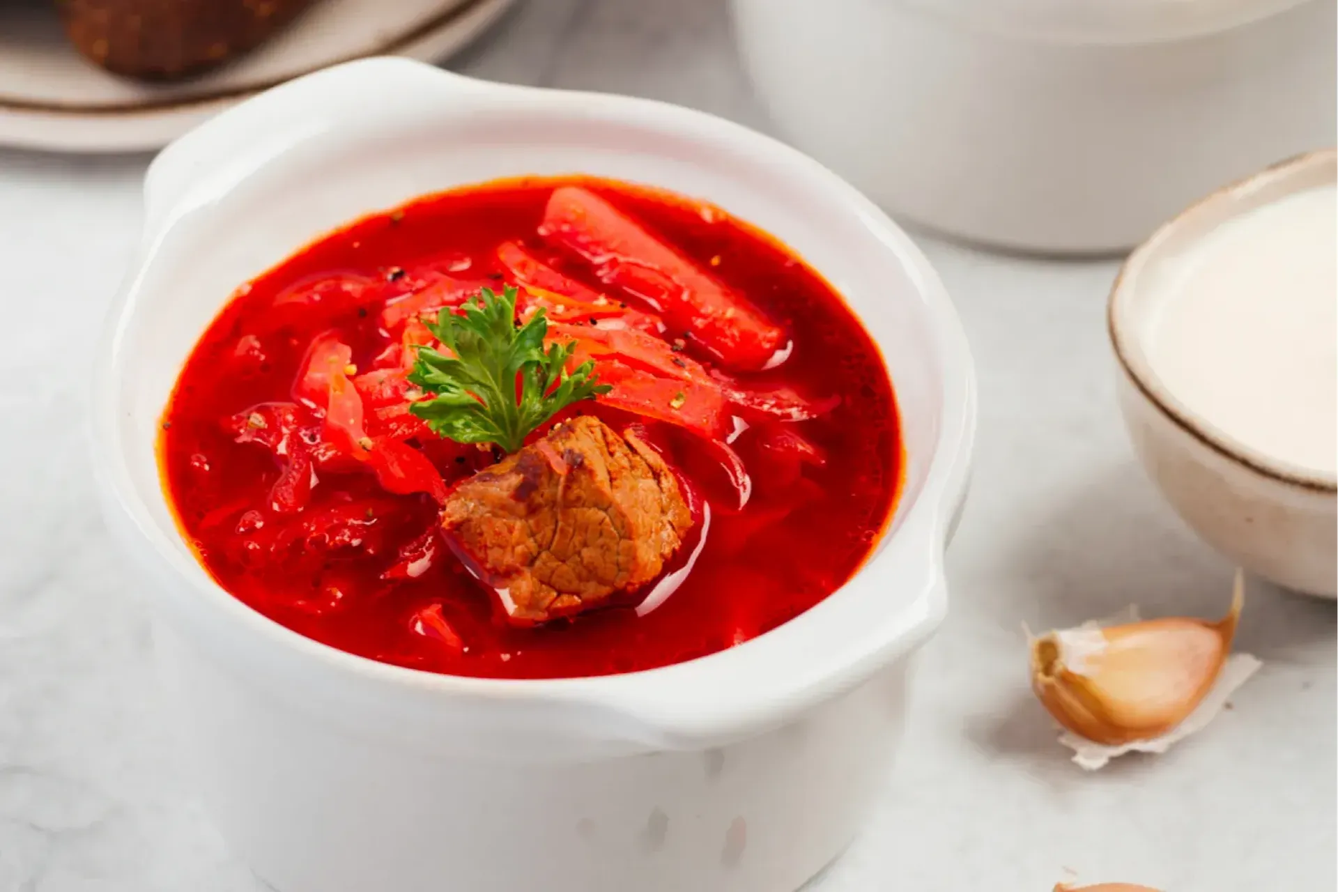 Насыщенный суп, где каждый ингредиент играет свою роль в создании богатого и сбалансированного вкуса. Телятина, обжаренная с овощами, дает основу, а свекла, капуста и картофель добавляют текстуру и гармонию. Вкус обогащается томатами, лимонным соком, сахаром и специями. После томления все ингредиенты сливаются в единую симфонию вкуса, а чеснок и лавровый лист придают борщу ароматную завершенность. Подается с кремовой сметаной и зеленью, чтобы сделать его ещё более уютным и сытным.