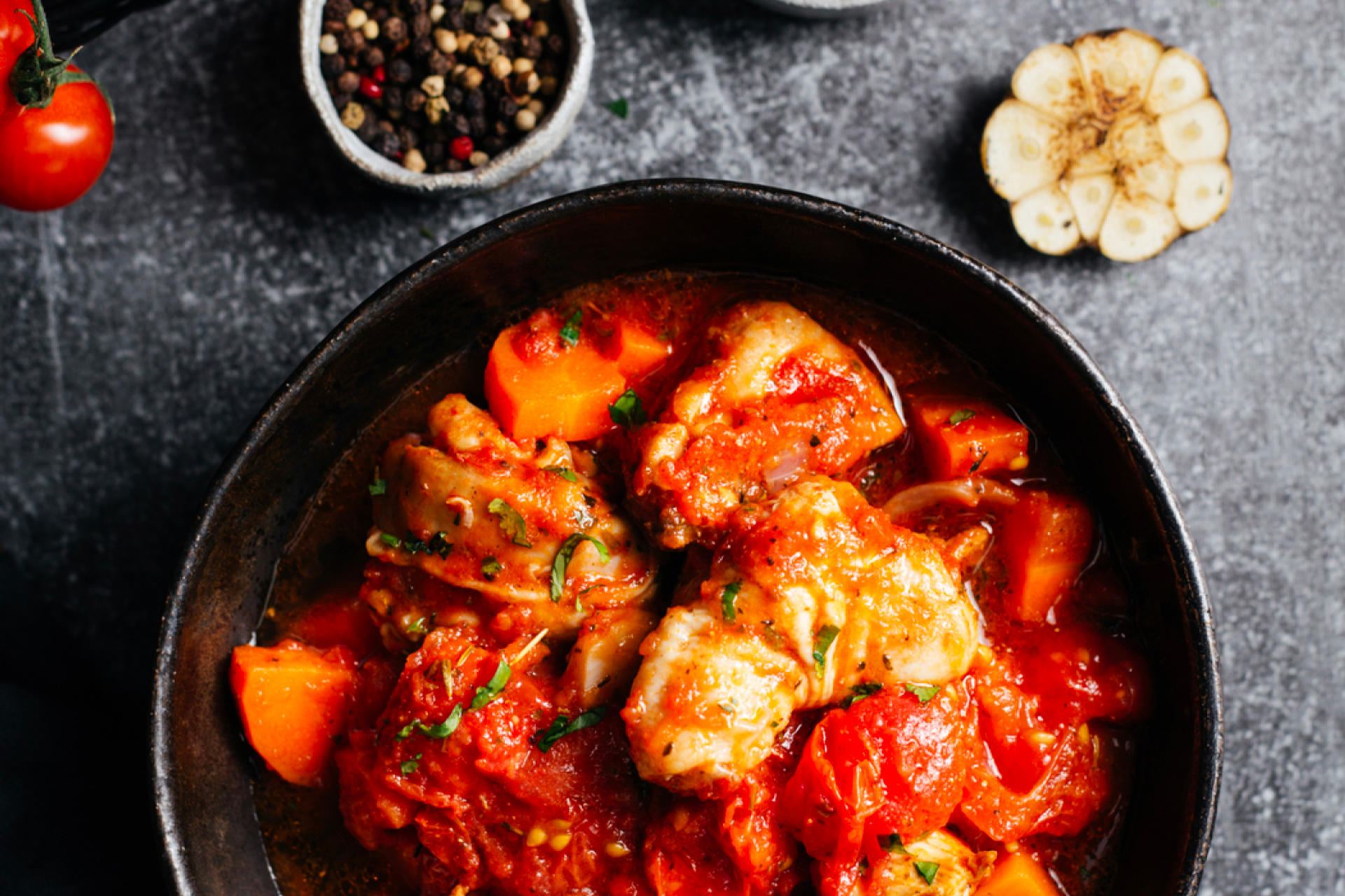 Крупно нарубите курицу, нарежьте полукольцами лук, помидоры и болгарский перец, измельчите чеснок.