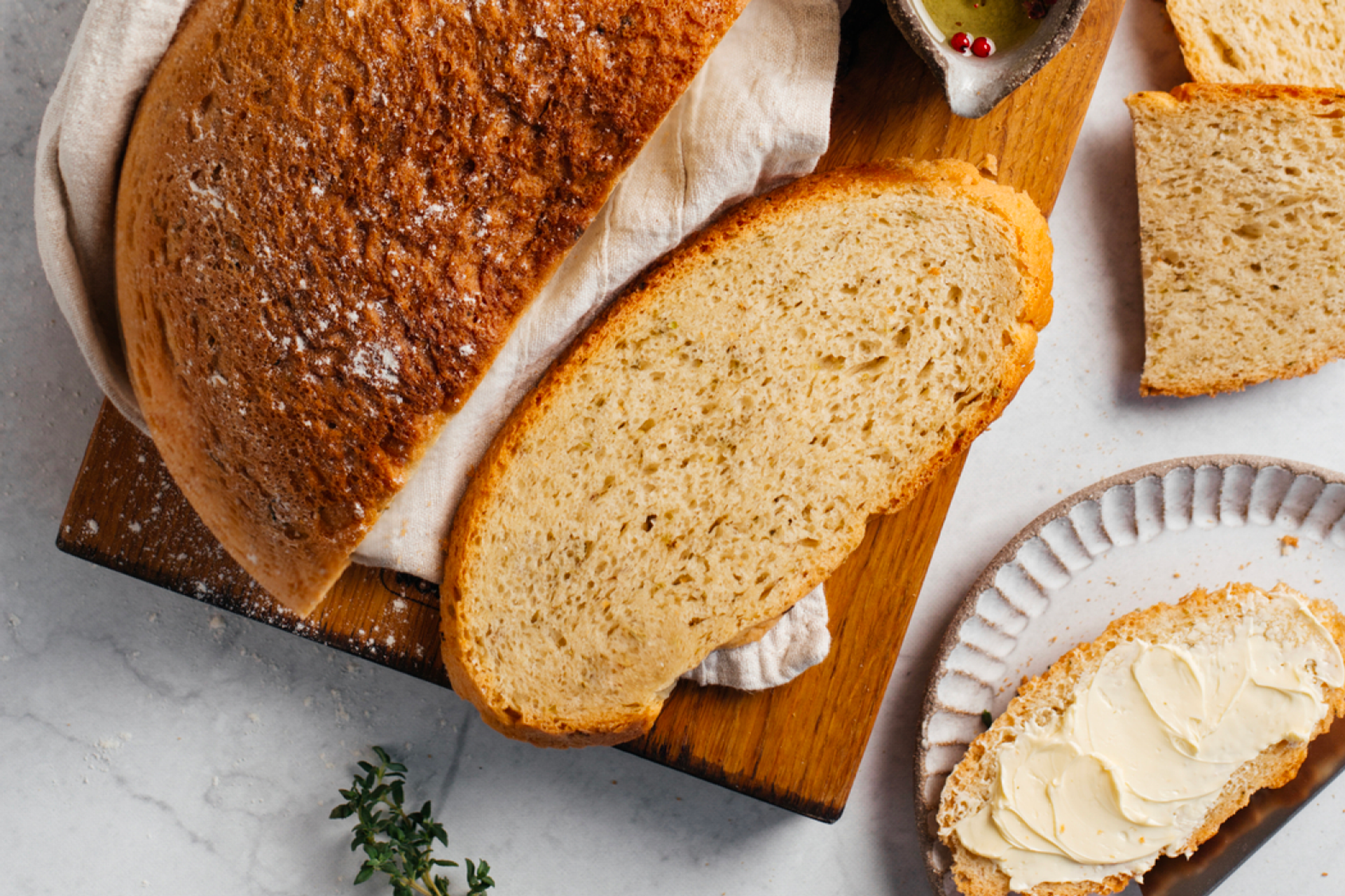Готовый хлеб нарезайте острым ножом и подавайте с чесночным маслом.