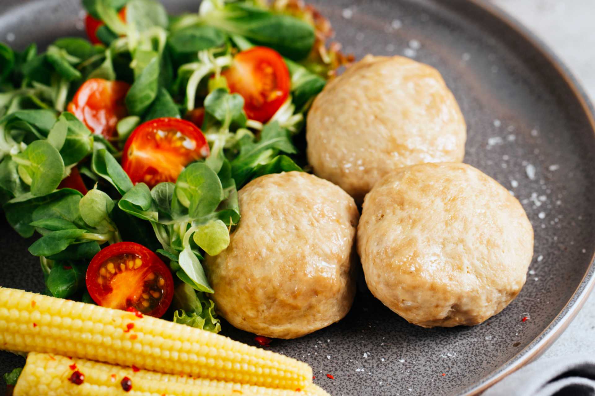 Филе индейки измельчается в фарш, приправляется солью и специями, из него формируются небольшие котлеты. Они выкладываются в паровую корзину, установленную над водой, и готовятся под крышкой до мягкости и сочности. Подаются котлеты с салатом из листьев салата и помидоров черри, с каплей оливкового масла, подчёркивающей их нежный вкус.