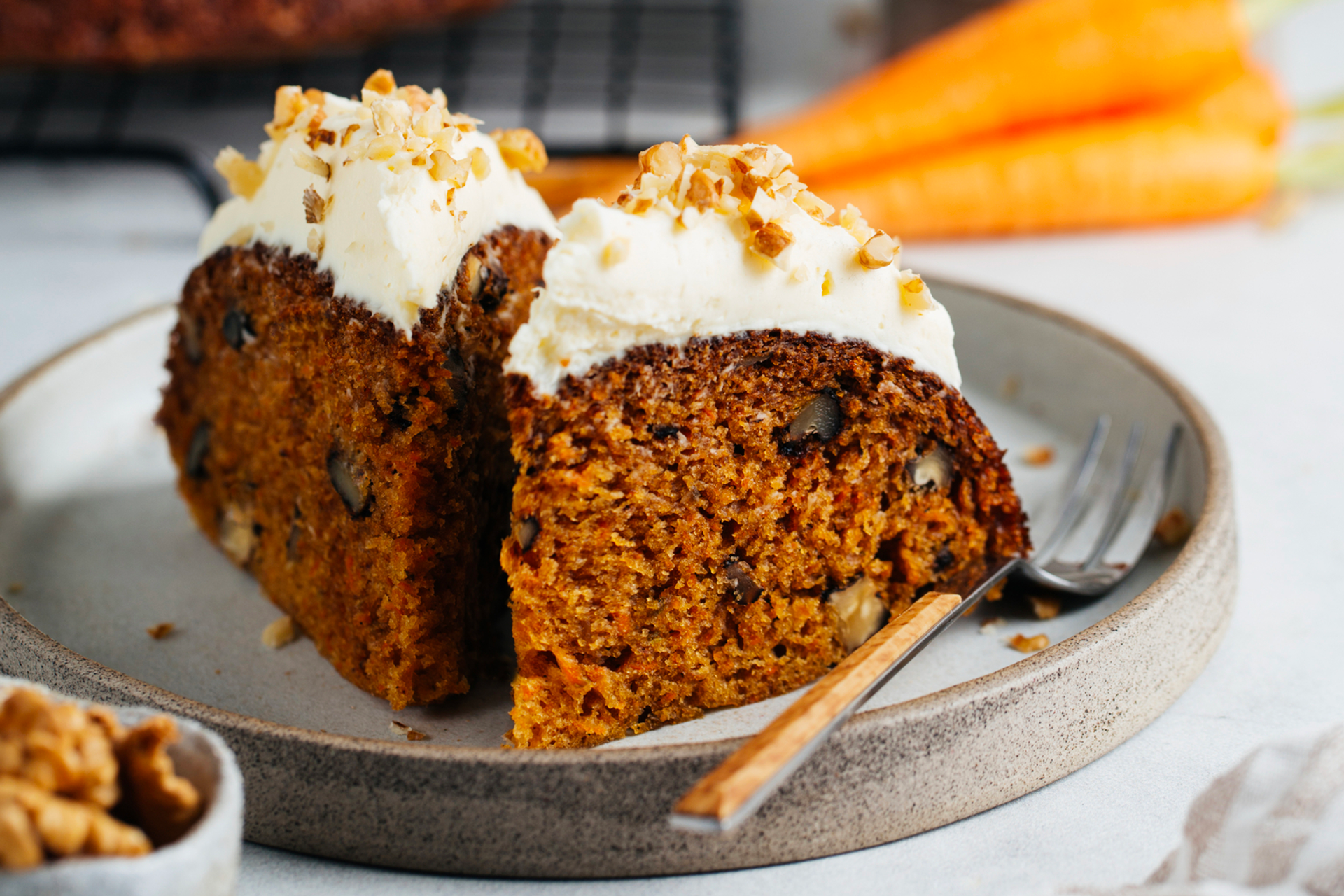Морковь мелко натирается и соединяется с яйцами, коричневым сахаром и ароматной цедрой апельсина. Затем к смеси добавляются мука, разрыхлитель, корица, мускатный орех, рубленые грецкие орехи, яблочное пюре и растительное масло — получается густое, пряное тесто. Оно выпекается до мягкого и ароматного коржа с тёплыми нотами специй. Остывший пирог покрывается нежным кремом из взбитого сливочного масла, сахарной пудры и маскарпоне, а сверху посыпается дроблёными орехами, создавая мягкий, сливочный и насыщенный десерт.