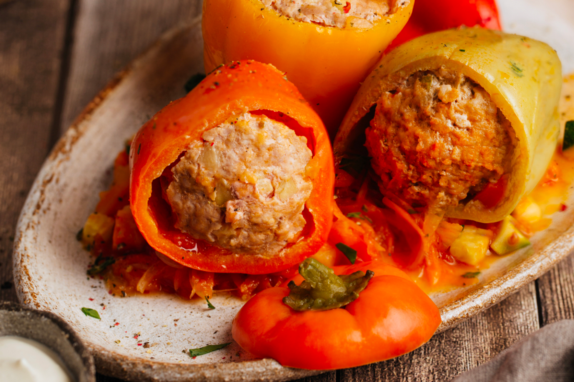 Перцы очищаются от семян и наполняются смесью мясного фарша, отварного риса, чили, соли и перца. Отдельно обжариваются лук и морковь, к ним добавляется томатная пассата, создавая насыщенную овощную основу. Фаршированные перцы укладываются в соус, заливаются водой и тушатся до мягкости. Готовые перцы подаются под нежным томатным соусом, со сметаной, сохраняя сочность начинки и яркость вкуса.