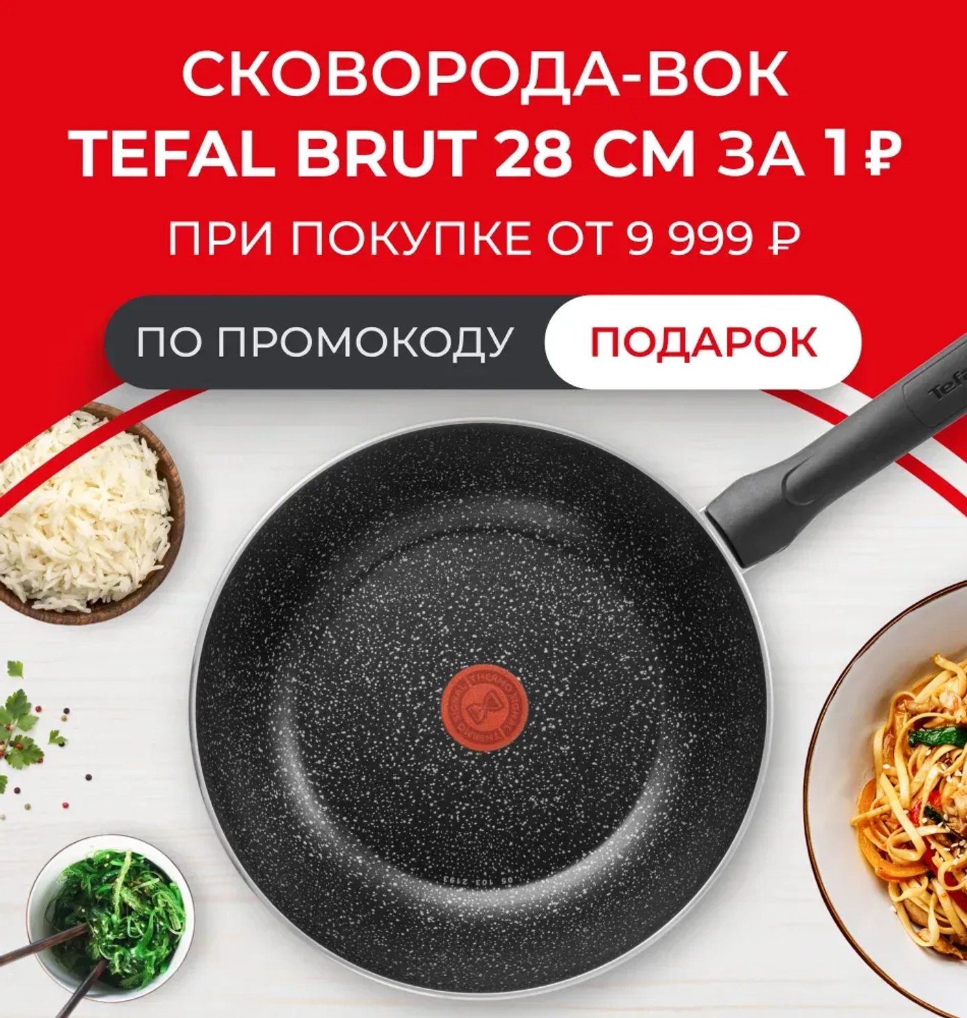 При покупке товаров на сумму от 9 999 рублей сковорода Tefal Brut 28 см* за 1 рубль по промокоду ПОДАРОК