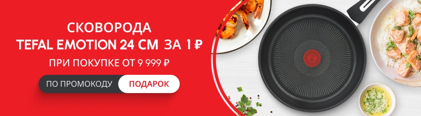 *Предложение не суммируется с баллами программы лояльности, другими акциями и промокодами. При возврате товара подарочный товар также возвращается. Акция действительна, пока сковорода Tefal Emotion 24 см есть в наличии.